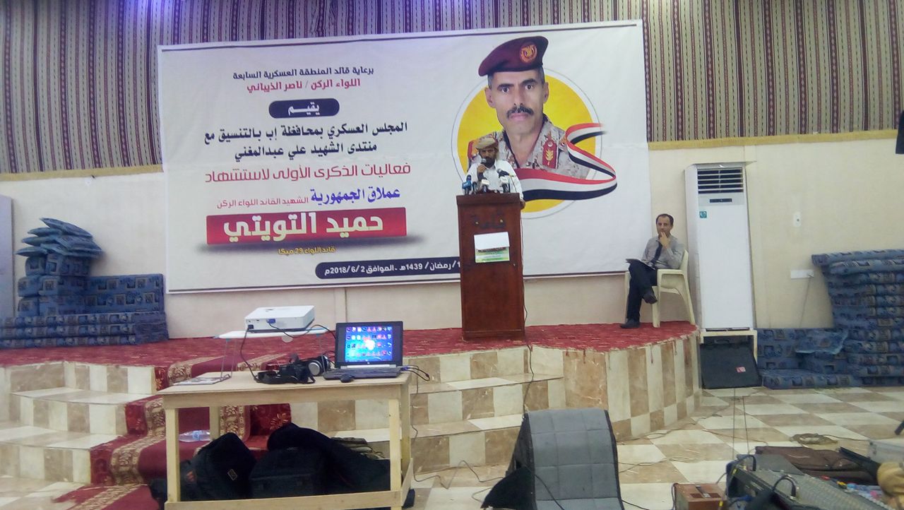 احيا المجلس العسكري لمحافظة إب بالتنسيق مع منتدى الشهيد علي عبد المغني في محافظة مأرب،  الذكرى السنوية الأولى لاستشهاد قائد اللواء29 ميكا اللواء الركن/ حميد التويتي.