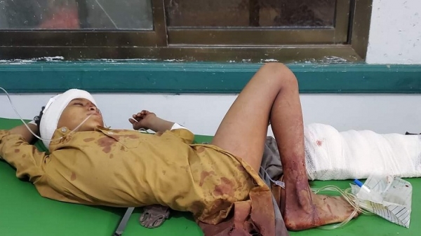 وقالت في بيان لها إنه سقطت قذيفة أخرى جوار أحد المنازل في نفس الحي، وتسببت في إصابة ثلاثة أطفال أثناء عودتهم من المدرسة ونتج عنه بتر رجلي الطفلين محمد ناصر فارع (10) سنوات وبدر ناصر المجنحي (8) سنوات وإصابة الطفل الثالث هاشم ناصر المجنحي (9) سنوات بشظايا متفرقه من جسمه.
