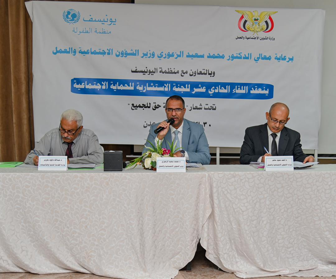 عقدت اللجنة الاستشارية للحماية الاجتماعية، في العاصمة الموقتة عدن، اللقاء الحادي عشر، برئاسة وزير الشؤون الاجتماعية والعمل رئيس اللجنة الدكتور محمد سعيد الزعوري.
