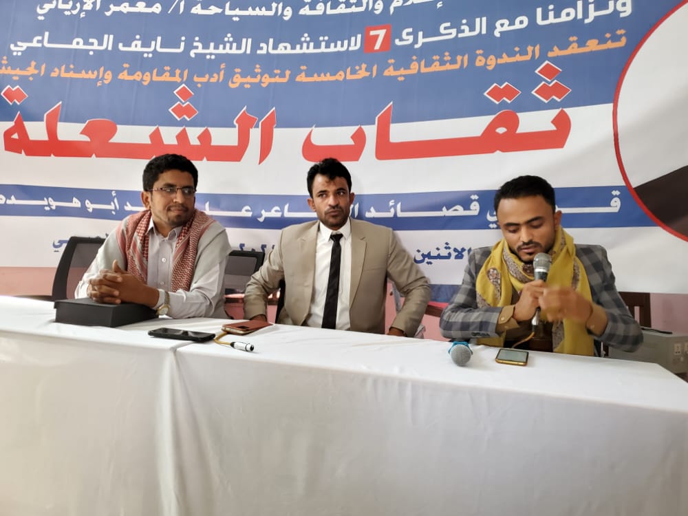 من جانبه أوضح رئيس منتدى وهج الجمهورية فواز الجماعي أن هذه الفعالية تأتي ضمن فعاليات وأنشطة الساعية لحفظ وتوثيق أدب وشعر المقاومة الذي أسسه الشاعر الراحل نايف الجماعي لدعم وإسناد أبطال الجيش الوطني ورجال المقاومة الشعبية في معركتهم الوطنية المصيرية.