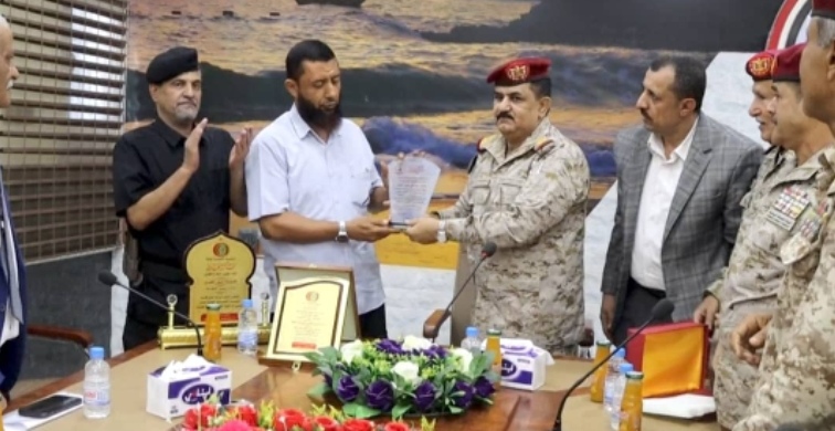 وقدم وزير الدفاع للأستاذ العمري درعا تكريميا تقديرًا لجهوده وإسهاماته الفاعلة خلال فترة توليه إدارة فرع المؤسسة بعدن.