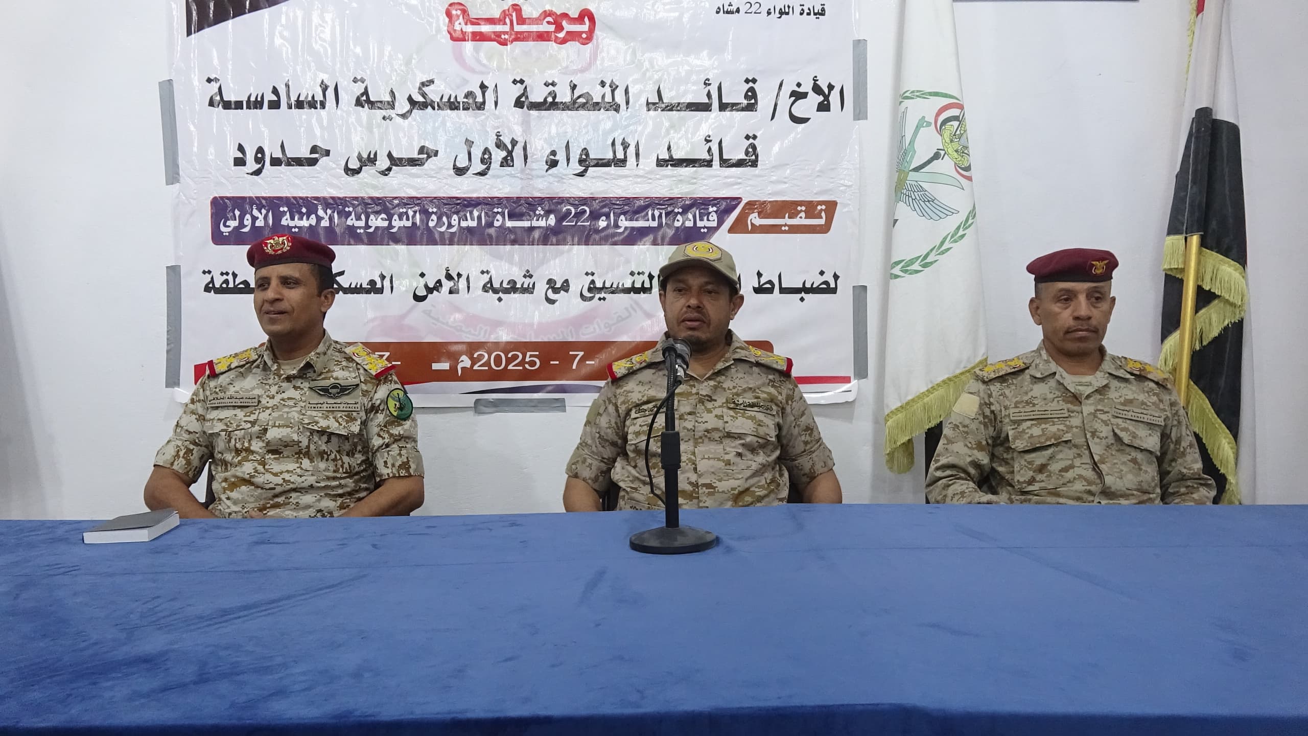 دشن قائد المنطقة العسكرية السادسة، قائد اللواء الأول حرس حدود، اللواء الركن هيكل حنتف، اليوم الإثنين، الدورة التوعوية الأمنية الأولى في المنطقة لضباط اللواء 22 مشاة.
