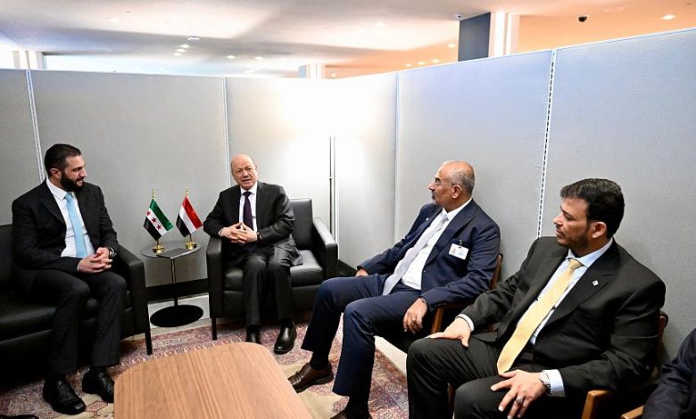 التقى فخامة الرئيس الدكتور رشاد محمد العليمي، رئيس مجلس القيادة الرئاسي اليوم الثلاثاء في نيويورك، ومعه عضوا المجلس اللواء عيدروس الزبيدي، والدكتور عبدالله العليمي، فخامة الرئيس أحمد الشرع، رئيس الجمهورية العربية السورية، وذلك على هامش اجتماعات الجمعية العامة للأمم المتحدة.