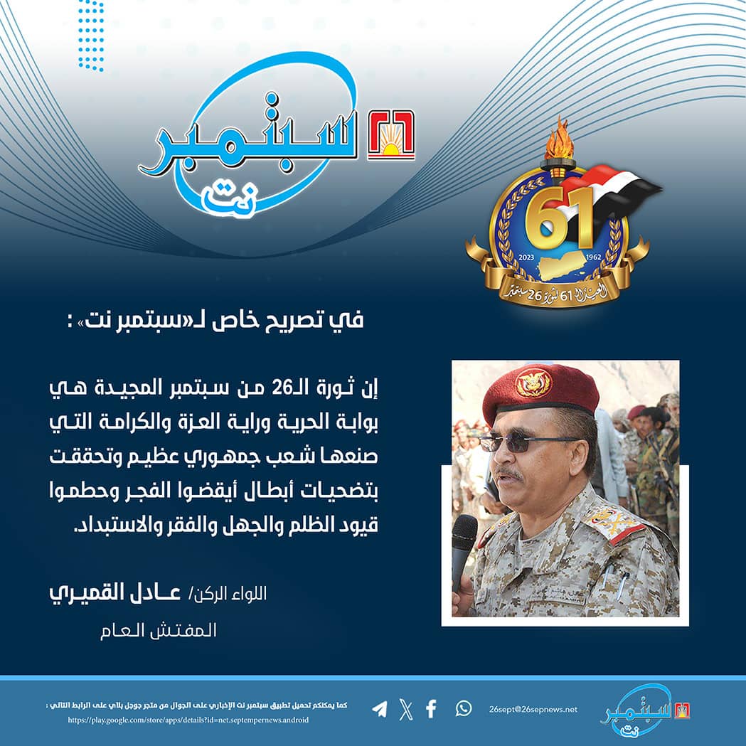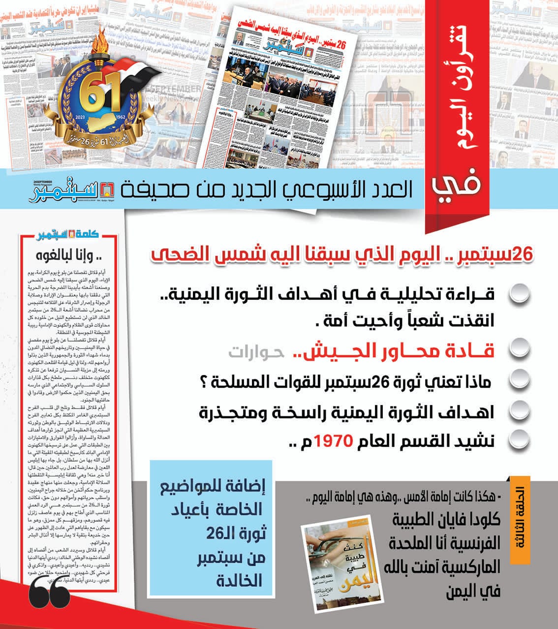 تقرأون اليوم في العدد الأسبوعي الجديد من صحيفة 26 سبتمبرتقرأون اليوم في العدد الأسبوعي الجديد من صحيفة 26 سبتمبر أكمل القراءة »
