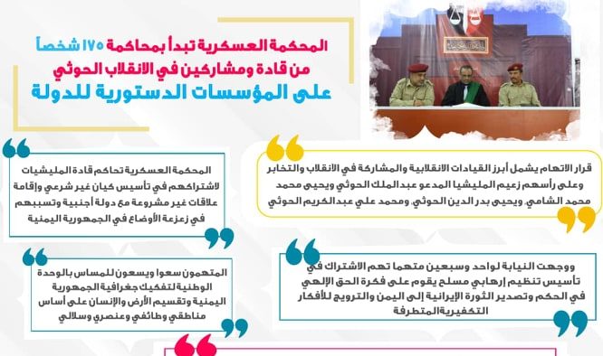 المحكمة العسكرية تبدأ بمحاكمة 175 متهما من قادة ومشاركين في الانقلاب الحوثي